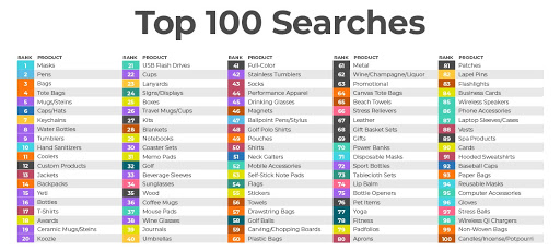 Masks: without doubt, face masks topped the charts as the most searched for promotional product, whether imprinted or blank. Although still ranking at the top for searches, the overall search rate for masks dropped by 20%.